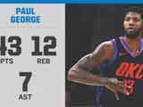 本场比赛,乔治上场38分钟,27投15中,三分8中4,罚球10中9,得到43分12篮板7助攻。