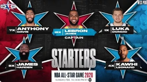 勒布朗-詹姆斯(队长)、安东尼-戴维斯、科怀-伦纳德、卢卡-东契奇、詹姆斯-哈登成为今年的全明星首发。