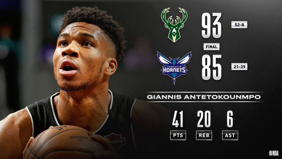 字母哥41+20+6雄鹿撞翻黄蜂 大洛16+7希尔11+5
