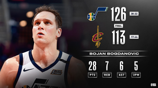 NBA常规赛继续进行,犹他爵士队(38胜22负)延续胜势。博格丹诺维奇得到28分、7个篮板和6次助攻,戈贝尔得到20分、9个篮板和5次盖帽,他们率队逐渐确立优势,爵士队在客场以126-113战胜克里夫兰骑士队(17胜44负)。爵士队拿到2连胜,骑士队遭遇3连败。