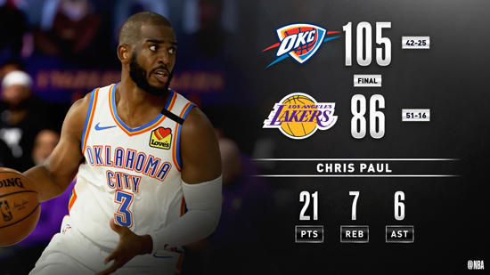 保罗21+7+6雷霆轻取湖人 詹皇19+11浓眉仅得9分