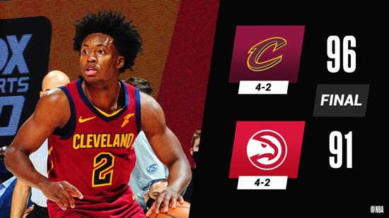 NBA常规赛继续进行,克里夫兰骑士队(4胜2负)止住连败。塞克斯顿得到27分,麦基得到14分、9个篮板和4次助攻,他们率队末节上演翻盘好戏,骑士队在客场以96-91逆转战胜亚特兰大老鹰队(4胜2负)。骑士队结束2连败。