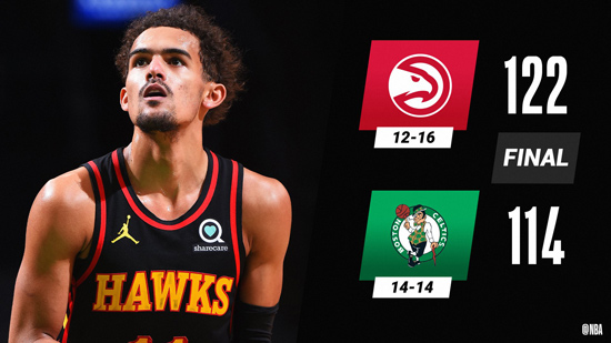 NBA常规赛继续进行,亚特兰大老鹰队(12胜16负)止住连败。杨得到40分和8次助攻,卡佩拉得到24分和13个篮板,科林斯也有20分,他们率队利用二三节攻势反超领跑,老鹰队顶住对手反攻,他们在客场以122-114险胜波士顿凯尔特人队(14胜14负)。老鹰队结束4连败。