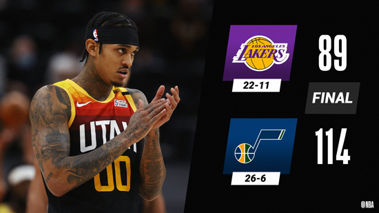 NBA常规赛继续进行,洛杉矶湖人队(22胜11负)的连败继续着。戈贝尔得到18分和9个篮板,康利得到14分、8个篮板和8次助攻,米切尔得到13分、10个篮板和8次助攻,他们率队前三节就确立大比分优势,犹他爵士队(26胜6负)在主场以114-89大胜湖人队。爵士队拿到2连胜,湖人队遭遇4连败。