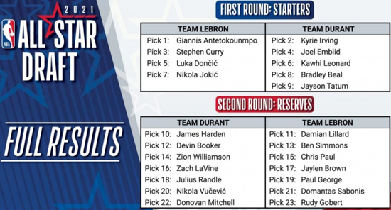 2021年全明星正赛队长选人正式结束,杜兰特、詹姆斯分别担任东西部队长。