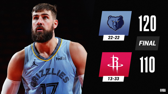 NBA常规赛继续进行,孟菲斯灰熊队(22胜22负)重拾胜利。瓦兰丘纳斯得到30分和15个篮板,梅尔顿得到23分,他们率队末节打出小高潮确立优势,灰熊队在客场以120-110战胜休斯敦火箭队(13胜33负)。灰熊队结束2连败。