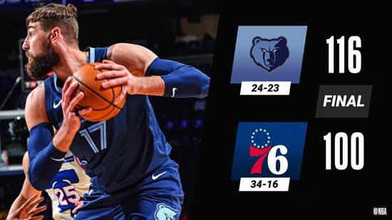 最后一节开始后不久科尔克马兹和霍华德率队连追6分,76人队以80-102落后。贝恩回应三分,琼斯、里德联手4分,76人队仍落后21分。大比分差距让比赛提前失去悬念,双方都尽遣替补,最终灰熊队以116-100获胜。